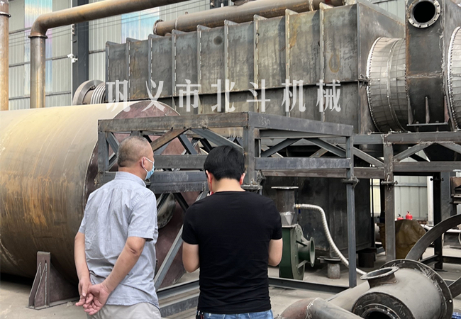北斗機(jī)械麻桿炭化爐采用回轉(zhuǎn)式滾筒結(jié)構(gòu),開始炭化麻桿時(shí)按照一定速度旋轉(zhuǎn),麻桿在炭化爐內(nèi)翻轉(zhuǎn)流動(dòng),使炭化更均勻,大約半小時(shí)開始產(chǎn)生可燃?xì)怏w,被煙氣回收系統(tǒng)收集后作為燃料給麻桿炭化爐加熱,這時(shí)可以關(guān)閉炭化爐的點(diǎn)火熱源,麻桿炭化爐實(shí)現(xiàn)燃燒能源的循環(huán)利用。炭化完成后從出料口進(jìn)行出炭,麻桿連續(xù)不斷進(jìn)入炭化爐進(jìn)行炭化,展開連續(xù)式生產(chǎn)模式。